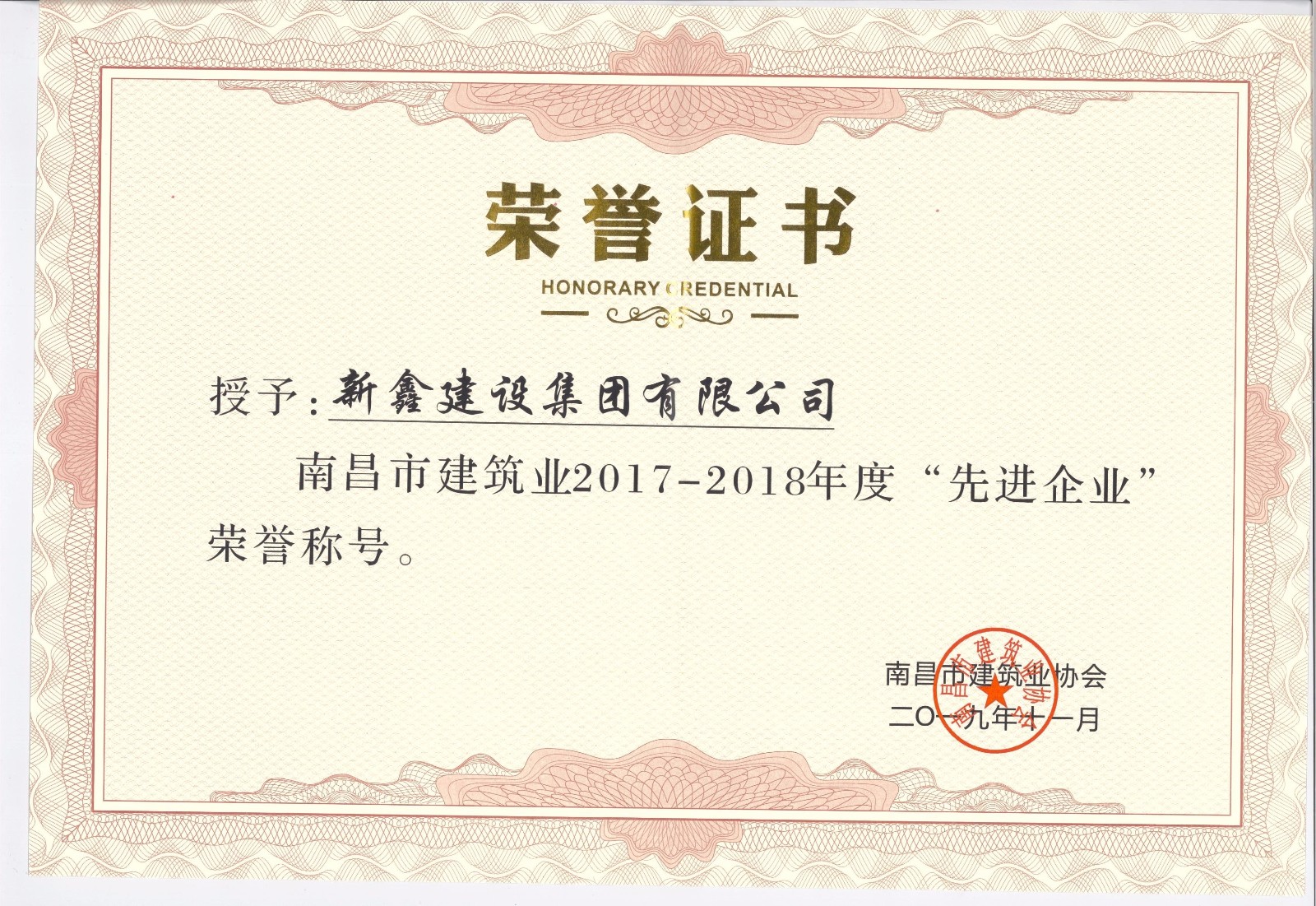 新鑫建設(shè)集團(tuán)有限公司榮獲南昌市建筑業(yè)2017-20...